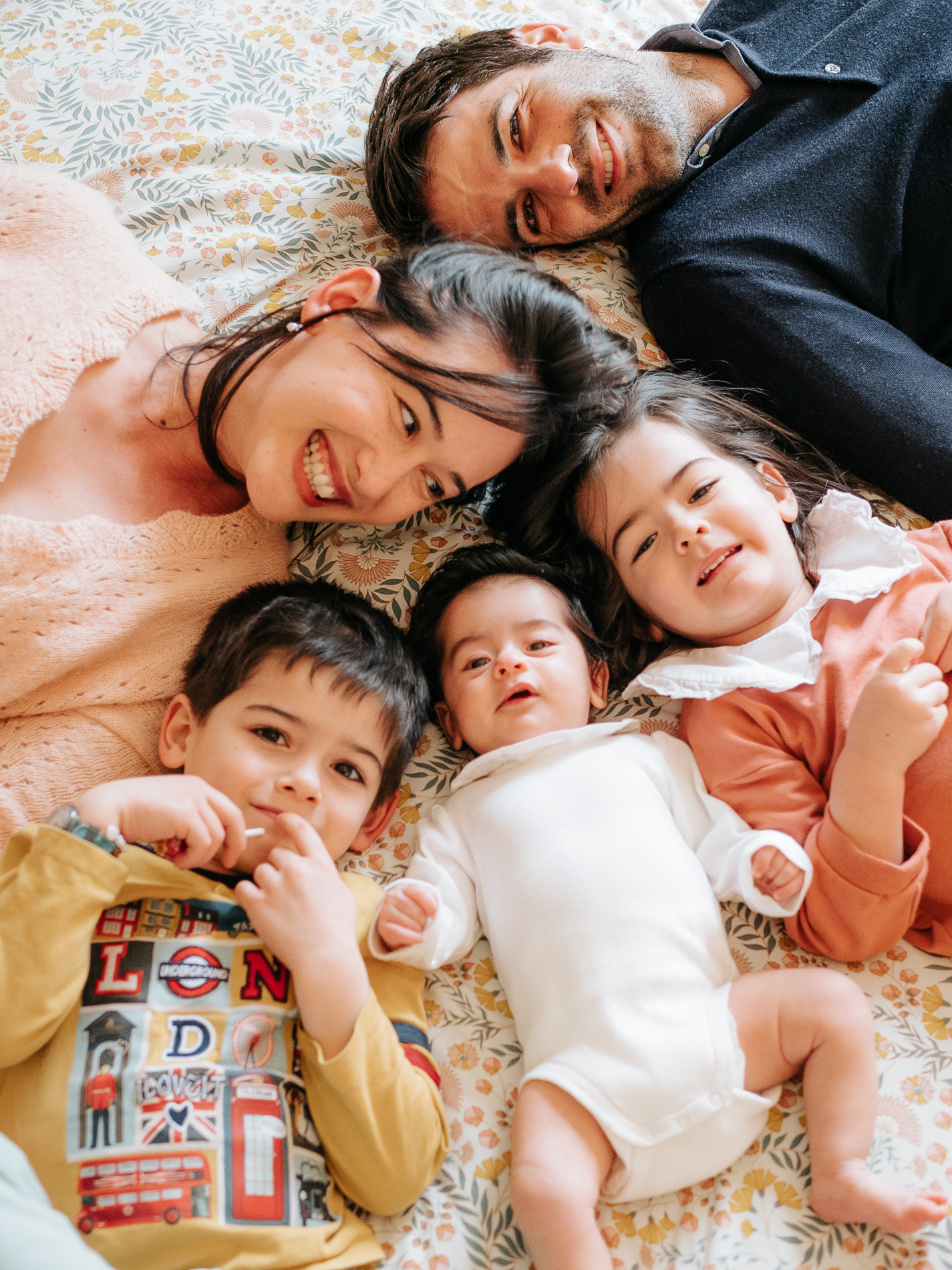 Ysée, qui a maintenant 4 mois, est née au début des vacances de Noël. Au départ, je me suis dit que ça allait être vraiment dur avec les grands toute la journée, mais en même temps, je n’avais pas du tout envie de les envoyer chez les grands-parents. Et en fait, ce temps tous ensemble dès le départ nous a permis de créer notre petite bulle. J’en garde le souvenir d’un moment suspendu tous les 5 dans notre maison. A l’inverse, c’est vrai que la douceur et le calme dont on a envie en post-partum étaient plus difficile avec le bruit que faisaient les aînés. Je l’ai eu plus tard, quand ils sont retournés à l’école et à la crèche.
