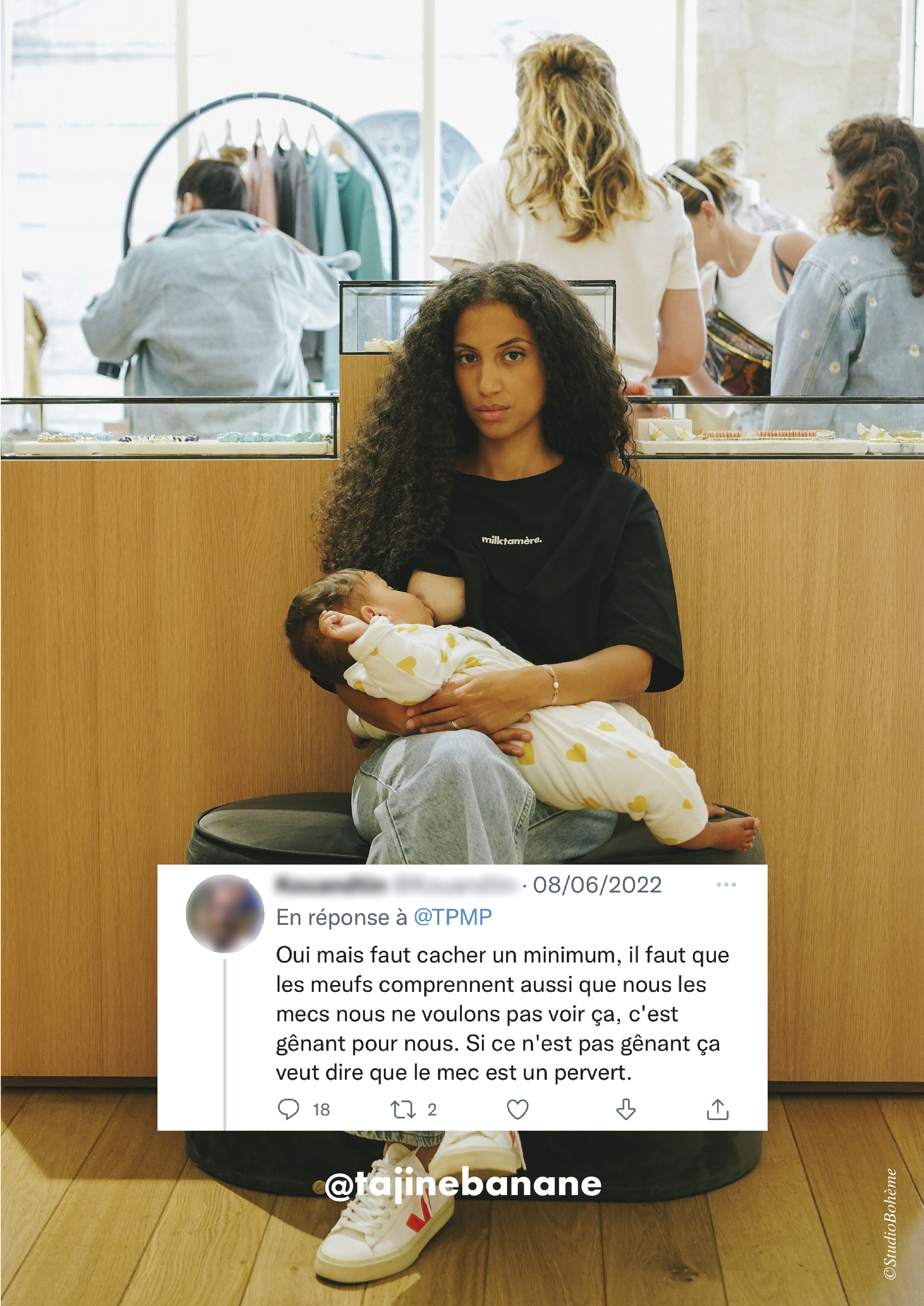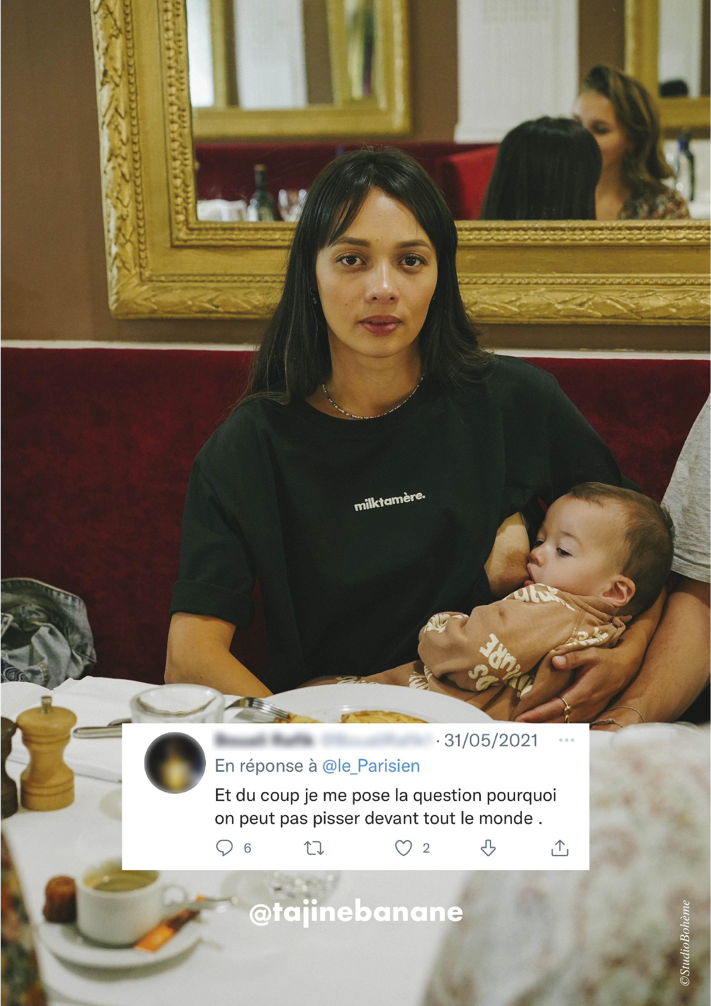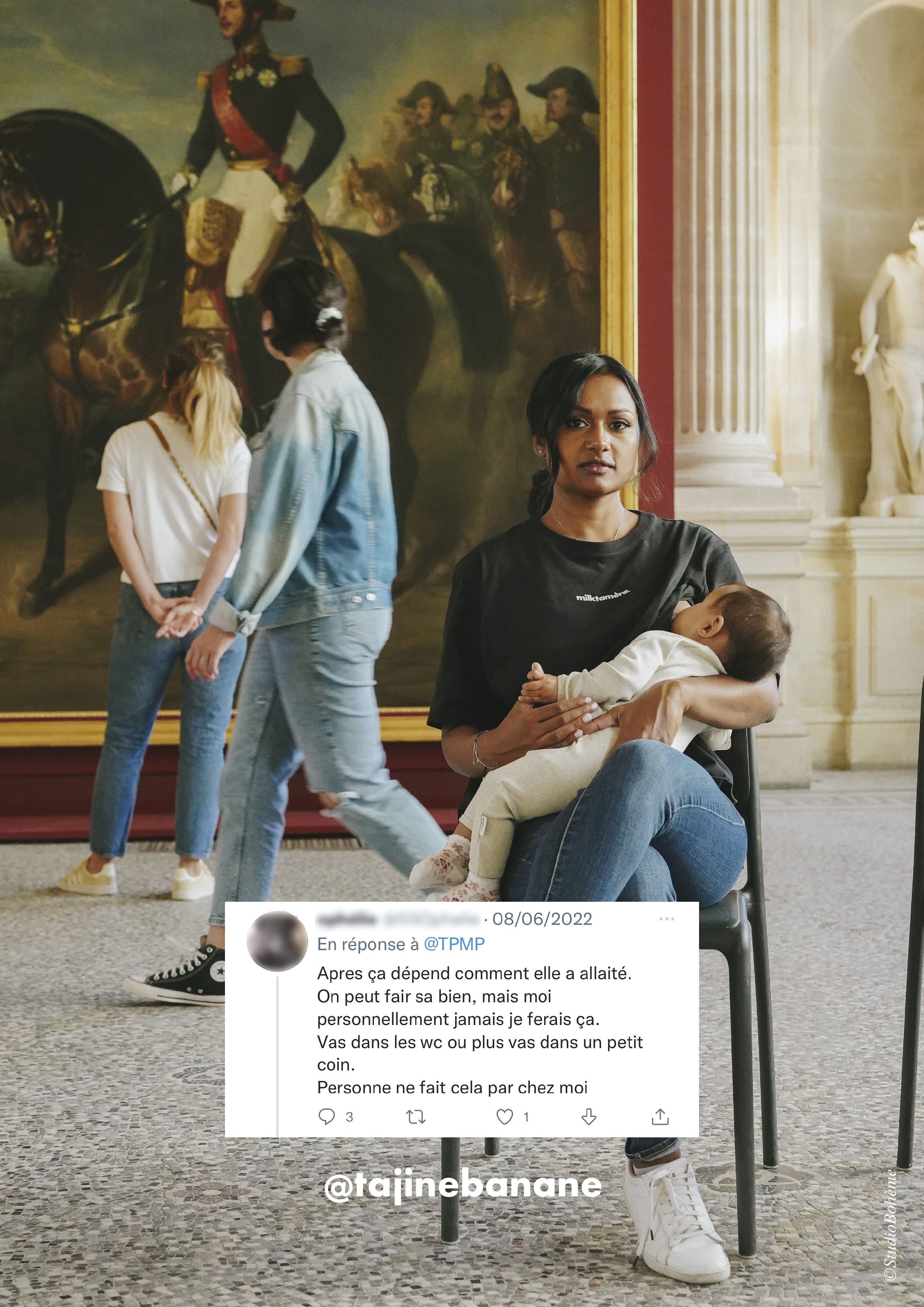 Ce sont des femmes qui n’ont pas forcément vécu de discriminations mais qui représentent le quotidien des mamans. D’ailleurs, on les a photographiées dans des lieux publics (tramway, restaurant, parc, boutique, laverie, musée) pour représenter des scènes spontanées et fidèles à leur vie de tous les jours. On a aussi Jasmine qui a accepté de poser sur nos affiches, j’en étais très touchée. On l’a prise en photo au sein du musée d’art contemporain de Bordeaux, c’était très symbolique. Pour elle, faire cette campagne, c’était se réapproprier son droit à allaiter partout et tout le temps.