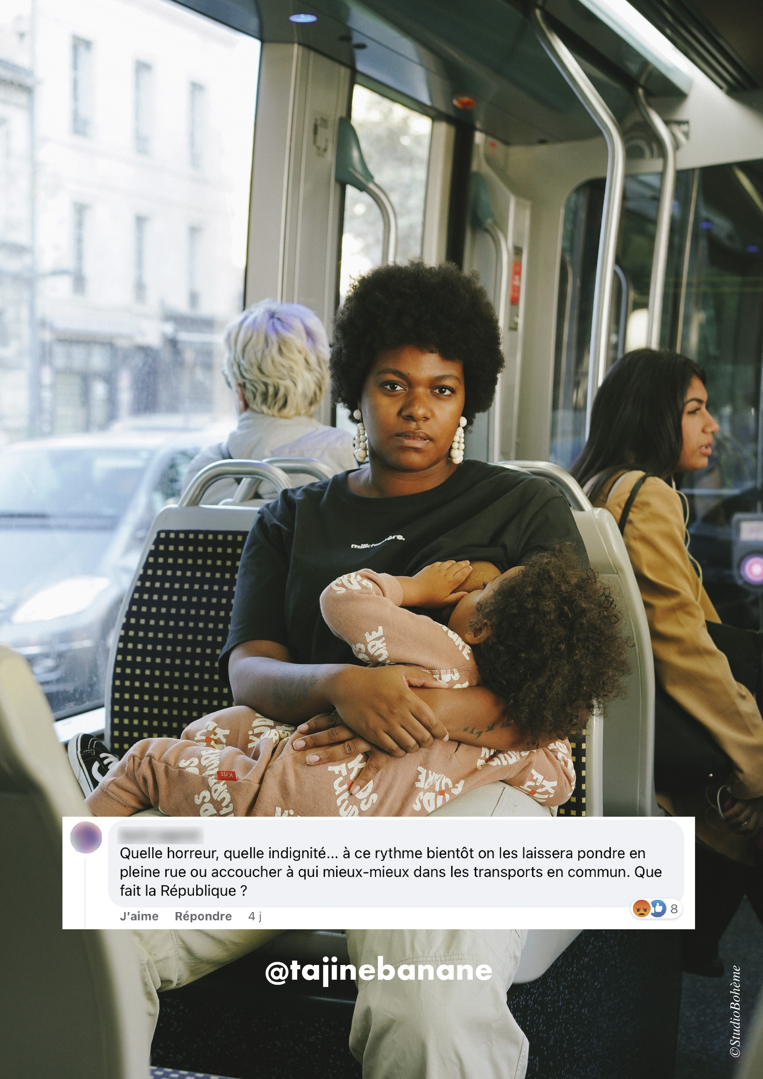 Chez Tajinebanane, nous sommes habitués à ce type d’action, nous avons déjà collé des affiches à nos débuts et encore l’année dernière. Mais j’étais très triste de voir ces derniers mois de nombreux délits d’entrave à l’allaitement. Il y a eu par exemple cette maman en janvier qui a dû allaiter dans sa voiture parce qu’un restaurant sur une aire d’autoroute lui avait refusé une place. Et puis il y a eu Jasmine dont je parlais au-dessus et à qui un agent de sécurité du Louvre a dit d’arrêter d’allaiter son bébé parce que «cela pouvait déranger une partie des visiteurs». Ce dont on ne se rend pas compte c’est que derrière ces mots il y a une immense détresse. Ces femmes se sentent empêchées de vivre et de sortir de chez elle parce qu’elles allaitent leur bébé. Surtout, ce n’est pas un débat comme on a pu le voir dans des émissions de grande écoute : l’allaitement est un droit, que ce soit chez soi ou dans l’espace public, point.